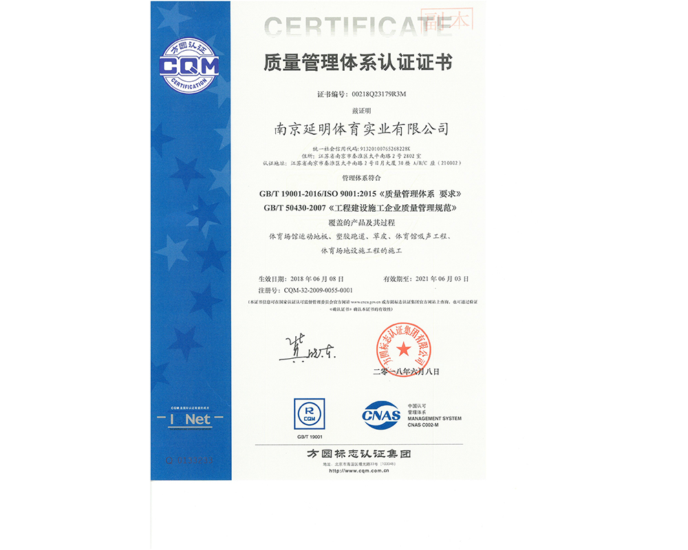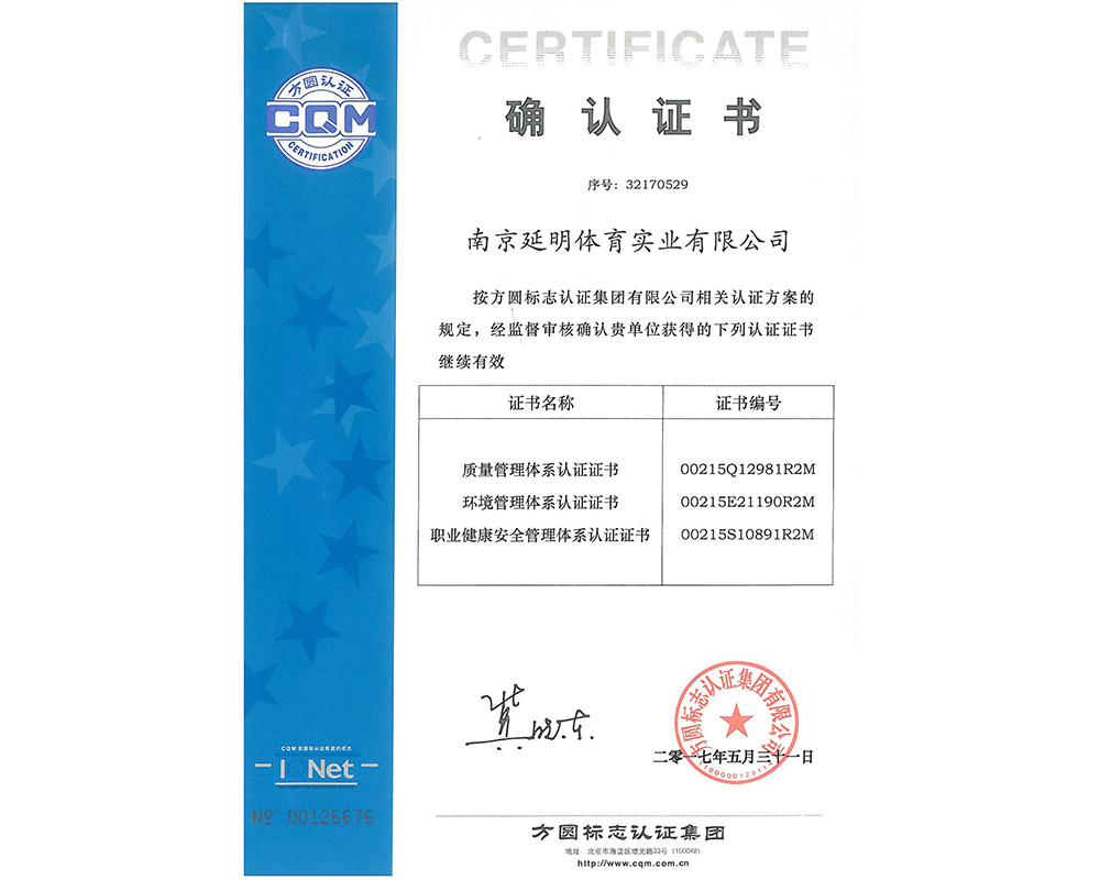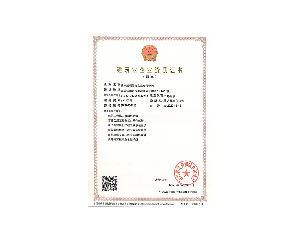 作为江苏省体育产业示范单位,九州官方网站体育拥有多年相关工程总承包施工经验,取得建筑工程施工总承包二级、古建筑工程专业承包二级、建筑装修装饰工程专业承包一级、电子与智能化工程专业承包一级、市政公用工程施工总承包二级资质;通过ISO 9001:2015质量管理体系认证;通过ISO14001:2015环境管理体系认证;通过IOS45001:2018职业健康安全管理体系认证。